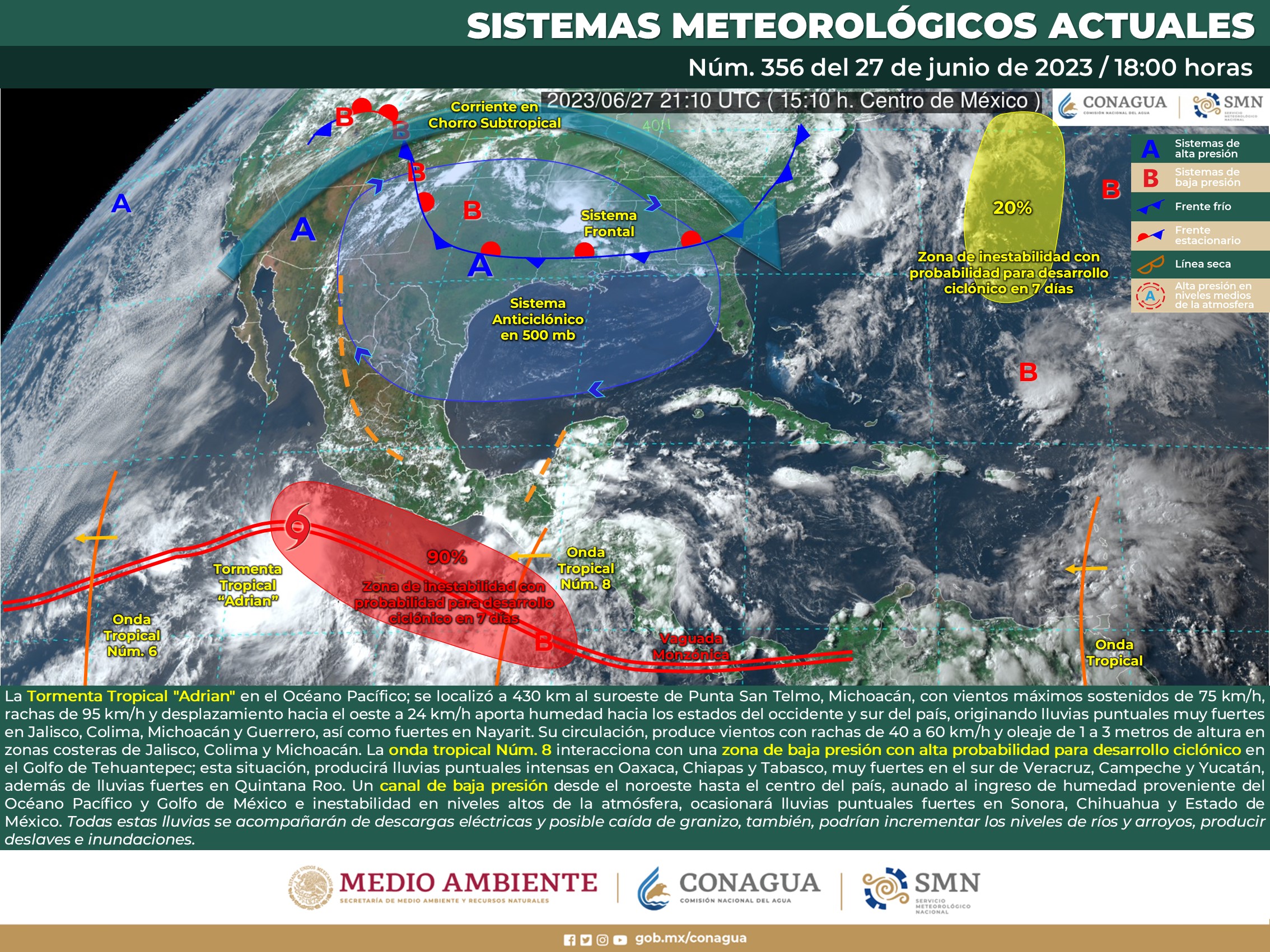 El centro de la Tormenta Tropical “Adrian” se localiza al suroeste de las costas de Colima y Michoacán, con desplazamiento hacia el oeste. Su circulación aporta humedad hacia los estados del occidentes y sur del país, originando lluvias puntuales muy fuertes, vientos fuertes y oleaje elevado en Jalisco, Colima, Michoacán y Guerrero, lo dio a conocer el Servicio Meteorológico Nacional perteneciente a la Comisión Nacional del Agua (CONAGUA) en el reporte de las 21:15 horas de este martes 27 de junio del 2023.