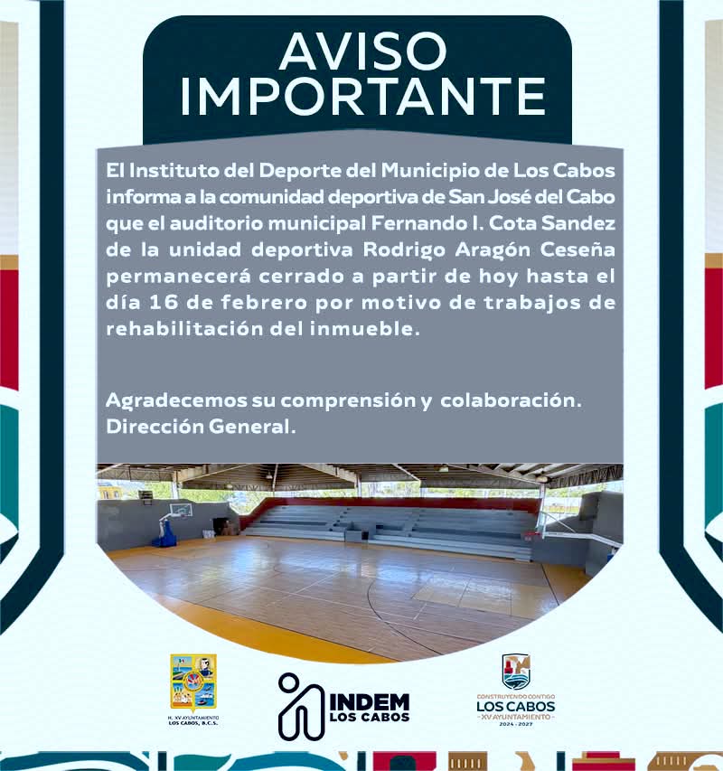 Los Cabos, Baja California Sur | 11 de febrero del 2026  .– El  XV Ayuntamiento de Los Cabos, a través del Instituto del Deporte del Municipio de Los Cabos (INDEM), informa que el Auditorio Municipal “Fernando I. Cota Sández”, ubicado en la Unidad Deportiva “Rodrigo Aragón Ceseña” en San José del Cabo, permanecerá cerrado del 10 al 16 de febrero del presente año.