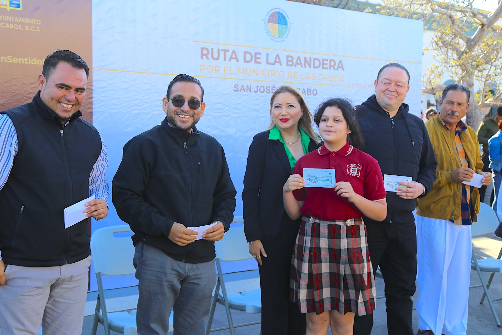 En el marco de la ceremonia de honores a los símbolos patrios que se realizó este lunes 27 de febrero en la explanada de la plaza pública Teniente José Antonio Mijares en San José del Cabo, autoridades del XIV Ayuntamiento de Los Cabos efectuaron la premiación a la niñez y juventud ganadora en los concursos de dibujo y declamación relativos al Día de La Bandera Nacional, mismos que se celebraron el pasado 10 de febrero en la biblioteca pública Pablo L. Martínez.