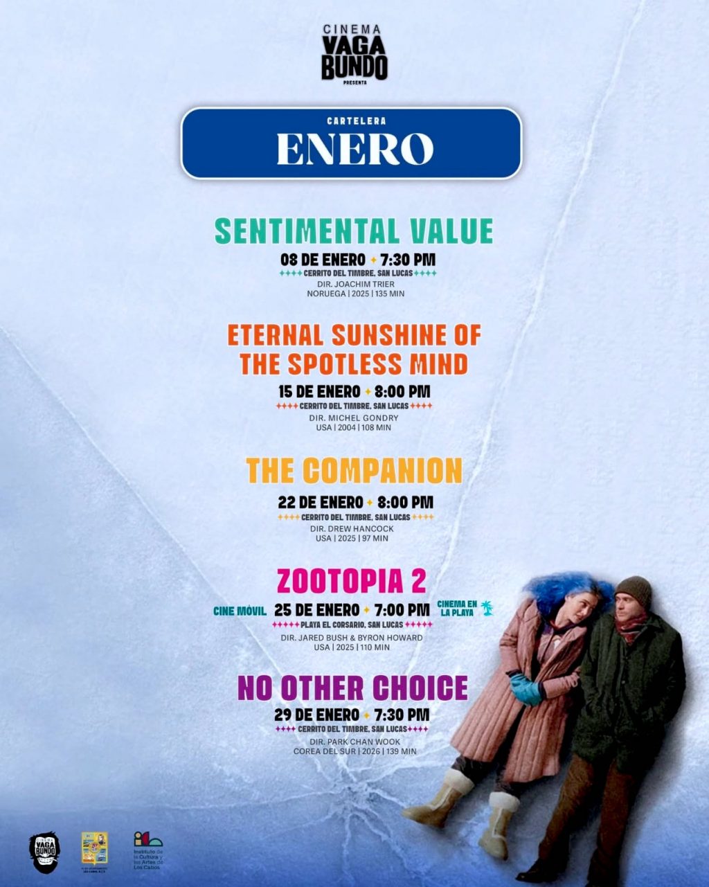 Las funciones se llevarán a cabo durante todo enero en la sede del Cerrito del Timbre, en Cabo San Lucas. La programación inicia el 08 de enero con Sentimental Value; continúa el 15 de enero con Eternal Sunshine of the Spotless Mind; el 22 de enero se proyectará The Companion; y el ciclo cerrará el 29 de enero con No Other Choice.