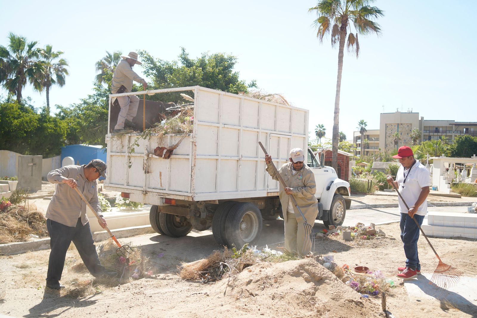 Para asegurar que los panteones se encuentren aptos para recibir a la comunidad, previo al Día de Muertos, en Los Cabos personal de la Dirección General de Servicios Públicos que encabeza Leonel Leyva Luna, lleva a cabo tareas de limpieza y mantenimiento, así como retiro de ramas y poda de árboles.