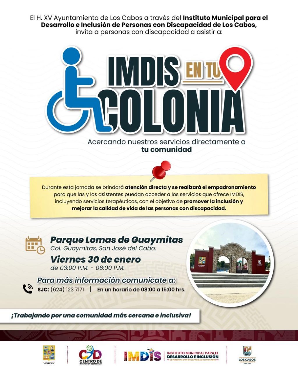 Los Cabos, Baja California Sur | 29 de enero del 2026.– Con la puesta en marcha del programa IMDIS en tu Colonia, el Gobierno de Los Cabos a través del Instituto Municipal para el Desarrollo e Inclusión de Personas con Discapacidad (IMDIS), acerca servicios de salud, terapias, talleres e integración entre la comunidad con discapacidad motriz y la autoridad municipal.