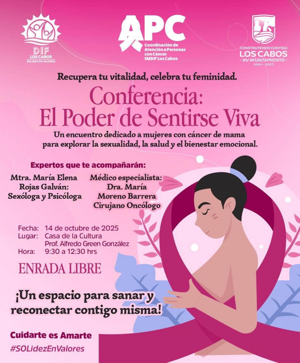 Los Cabos, Baja California Sur.- Con el compromiso de fortalecer el bienestar físico y emocional de las mujeres que enfrentan cáncer de mama, el XV Ayuntamiento de Los Cabos, a través de la Coordinación Municipal de Atención a Personas con Cáncer del Sistema Municipal para el Desarrollo Integral de la Familia (DIF), llevará a cabo la conferencia “El Poder de Sentirse Viva”, un espacio diseñado para fomentar la reflexión, la autoaceptación y el empoderamiento femenino ante los retos que conlleva esta enfermedad.