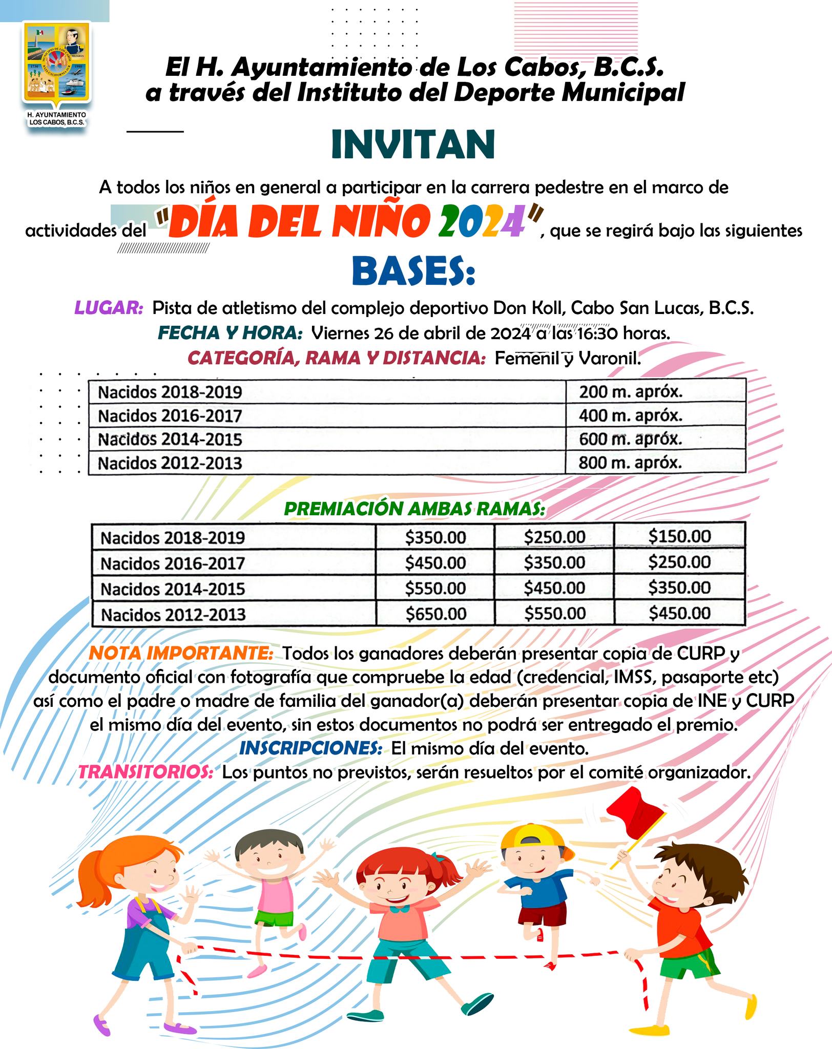 A fin de brindar un espacio de convivencia familiar, así como motivar la sana competencia entre niñas y niños, el Gobierno de Los Cabos a través del Instituto del Deporte (INDEM), invita a todas las niñas y niños en general a participar en la carrera pedestre a realizarse en el marco de las actividades del Día de la Niñez 2024, este viernes 26 de abril a las 4:30 de la tarde en la unidad deportiva Don Koll de Cabo San Lucas.
