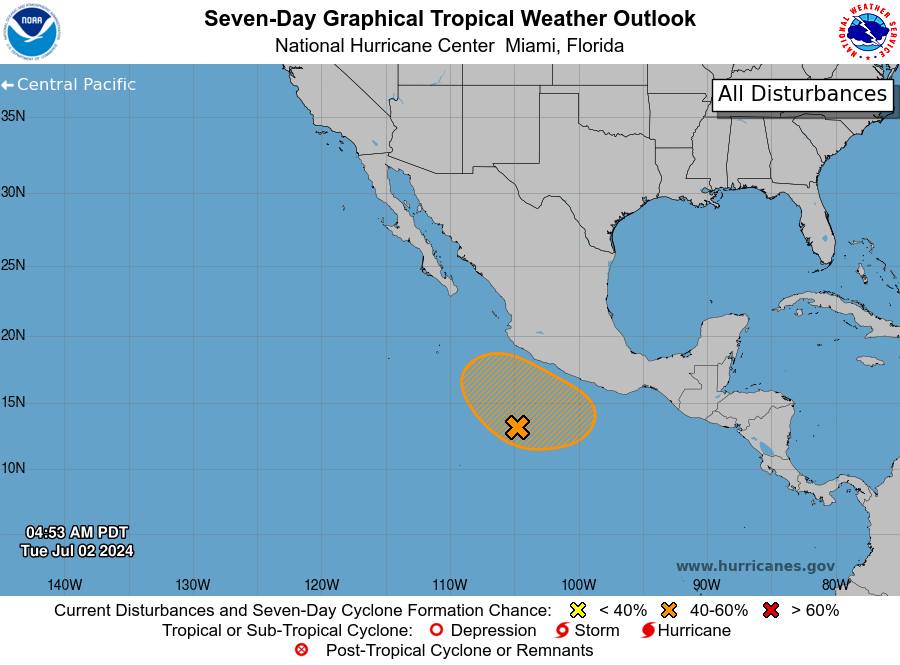 De igual forma, se da a conocer que se continúa monitoreando la amplia zona de baja presión, la cual incrementa gradualmente su probabilidad para desarrollo ciclónico debido a las condiciones ambientales: «Quiero informar que en los próximos días este fenómeno, localizado en el Pacífico, podría convertirse en depresión tropical mientras se desplaza de norte a noroeste; actualmente, presenta un 30% de probabilidad a 48 horas y un 50% a 7 días», explicó Jesús López Armenta, jefe de monitoreo.