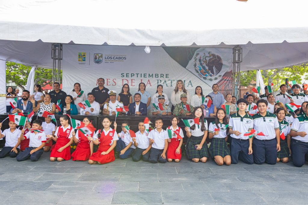 En Cabo San Lucas, la delegada Karina de la O Uribe, presidió ceremonia cívica, destacando en su mensaje que en estas fechas se recuerda a los héroes que dieron la libertad e independencia, además de que representa una oportunidad para reflexionar sobre lo que significa ser parte de la gran nación.
