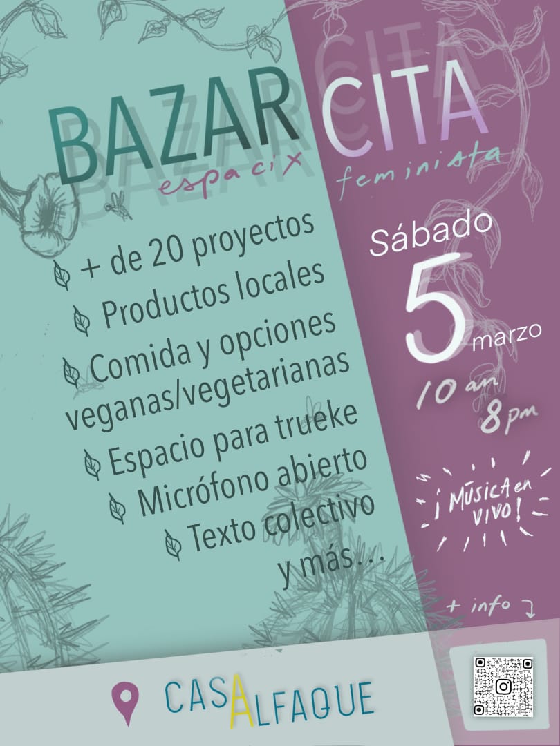 Un grupo de más de 20 emprendedoras simpatizantes con el movimiento feminista en colaboración con Casa Alfaque, llevarán a cabo la primera edición de La Bazarcita este sábado 5 de marzo de 10:00 a 20:00 horas en Guillermo Prieto esquina con Nayarit, col. Pueblo Nuevo, La Paz, BCS.