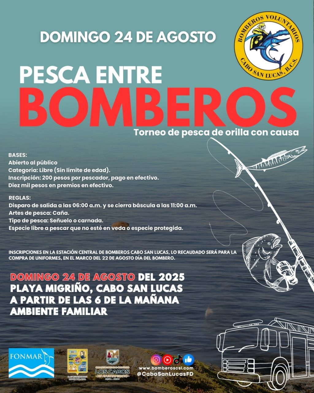 Los Cabos, Baja California Sur | 20 de agosto del 2025.- El próximo domingo 24 de agosto se efectuará una actividad con causa: el Torneo de Pesca de Orilla, organizado por el Cuerpo de Bomberos de Cabo San Lucas, un evento que busca combinar la pasión por la pesca con el apoyo a la compra de uniformes para sus brigadas, en conmemoración del Día del Bombero que se celebra el 22 de agosto.