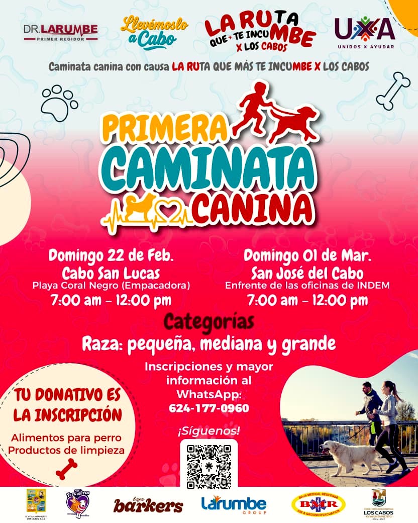 Los Cabos, Baja California Sur | 16 de febrero del 2026.– A través de la Primera Regiduría, encabezada por el doctor José Manuel Larumbe Pineda, se realizará la Primera Caminata Canina – LA RUta que más te incuMBE X Los Cabos, una actividad recreativa con causa enfocada en la convivencia responsable entre familias y sus mascotas.