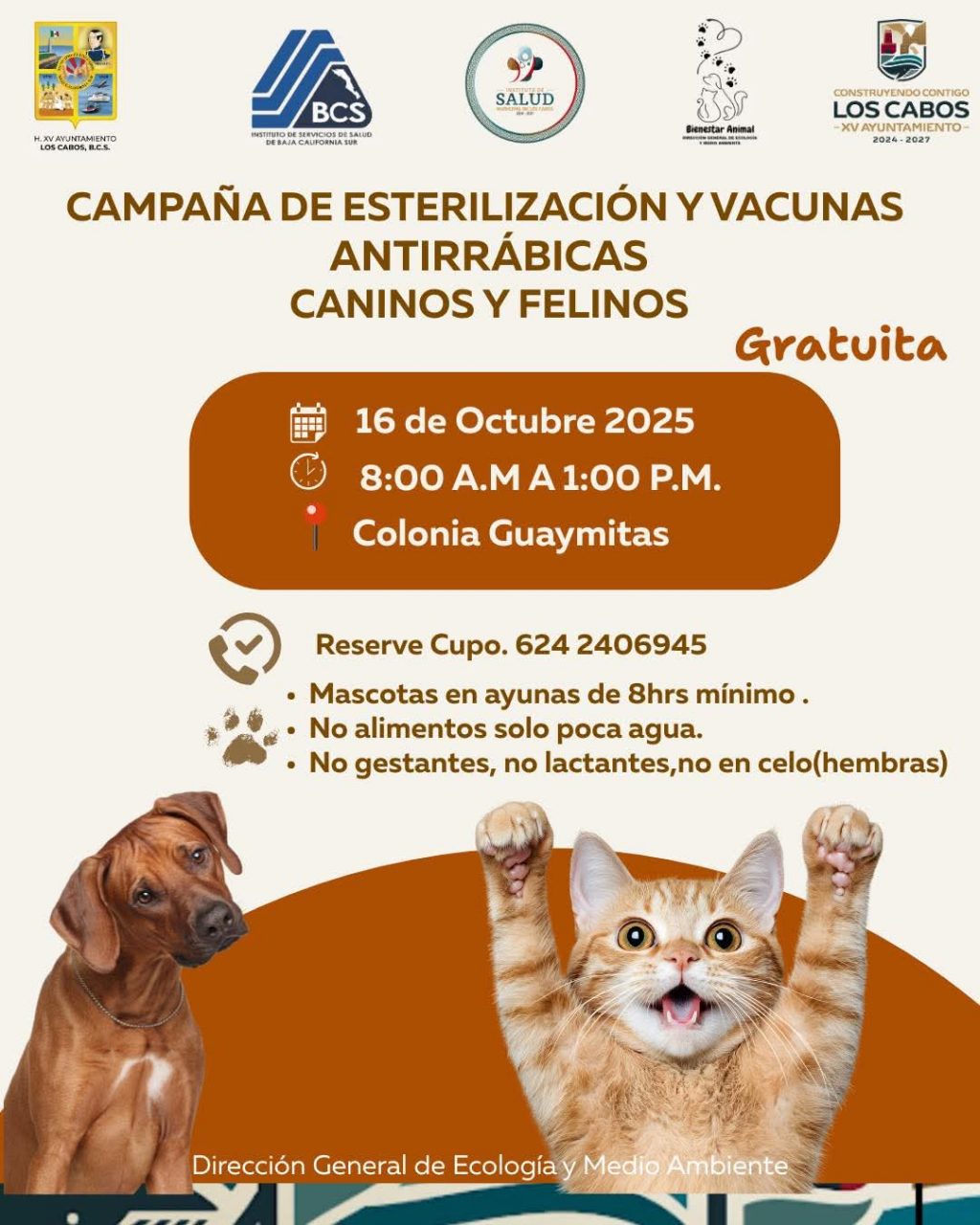 Los Cabos, Baja California Sur | 13 de octubre del 2025.- El XV Ayuntamiento de Los Cabos, a través de la Dirección General de Ecología y Medio Ambiente y en coordinación con la Secretaría de Salud, el Comité de Bienestar Animal y Salud Municipal invita a las personas propietarias de animales de compañía a participar en la jornada gratuita de esterilización canina y felina, que se llevará a cabo este jueves 16 de octubre, en la colonia Guaymitas, en San José del Cabo, en un horario de 08:00 a 13:00 horas.