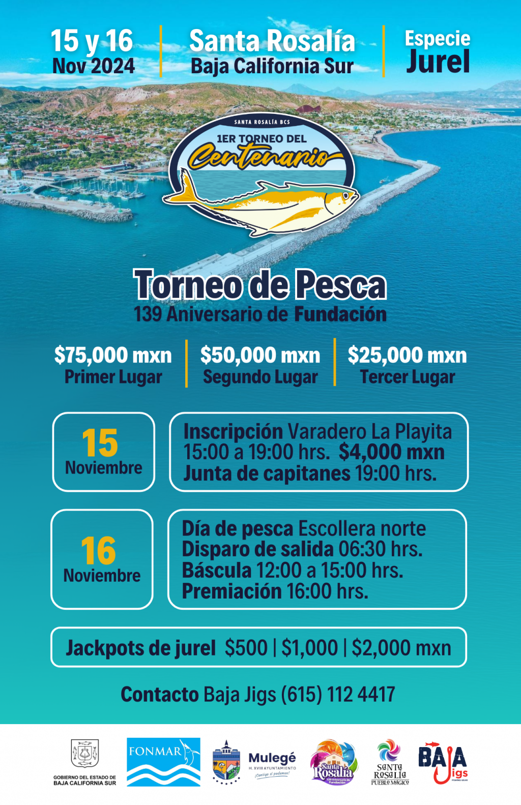 El Gobierno del Estado de Baja California Sur, a través del Fondo para la Protección de los Recursos Marinos (FONMAR) y el Ayuntamiento de Mulegé, te invitan a formar parte del “Primer Torneo de Pesca del Centenario” a realizarse en Santa Rosalía el próximo 15 y 16 de noviembre.