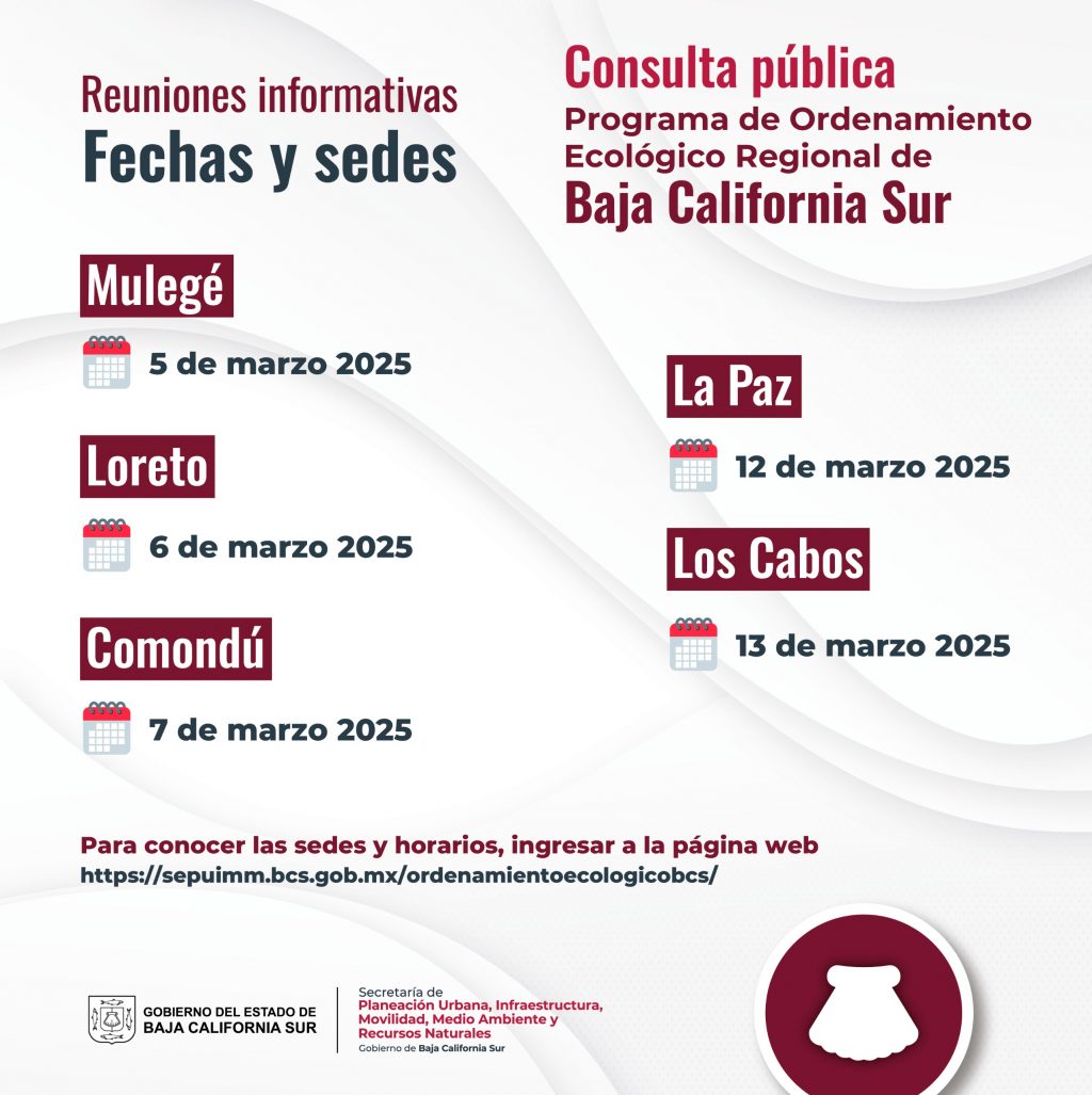Con el objetivo de fomentar la participación ciudadana en la planeación ambiental del estado, llevarán a cabo cinco reuniones informativas en los municipios para propiciar la participación ciudadana como parte de la Consulta Pública del Programa de Ordenamiento Ecológico Regional del Estado de Baja California Sur (POERBCS)», de acuerdo con la convocatoria iniciada el pasado 15 de enero de 2025.