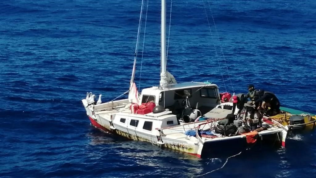 Este lunes, un atunero de la empresa Grupo Mar de la marca Tuny rescató en el pacífico a mil 200 millas de tierra a la embarcación “Aloha Toa” tipo catamarán, en el que viajaba ciudadano Australiano Timothy Lyndsay Shaddock y su perrita Bella, quien manifestó haber naufragado hace tres meses, luego de haber zarpado del puerto de La Paz y que se diría a la Polinesia Francesa.