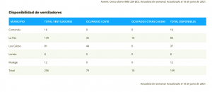 En el caso de respiradores Los cabos tiene el mayor número de pacientes ocupando estos equipos siendo 44 y tiene un total de 81 respiradores en existencia, quedando 37 disponibles; La Paz tiene 35 pacientes con respirador y tiene en existencia 139, quedando disponibles 86; los municipios de Comondú, Loreto y Mulegé no registran pacientes con respiradores.
