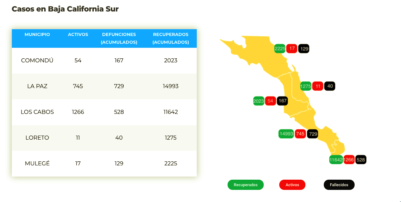 Esta noche, al actualizarse la información oficial en la página de la Secretaría de Salud de Baja California Sur se reportó un incremento de casos en los municipios de La Paz (746 casos positivos) y Los Cabos (con mil 266 casos) principalmente, que hacen un total con la suma de los tres municipios restantes de 2 mil 093 casos positivos en Baja California Sur.