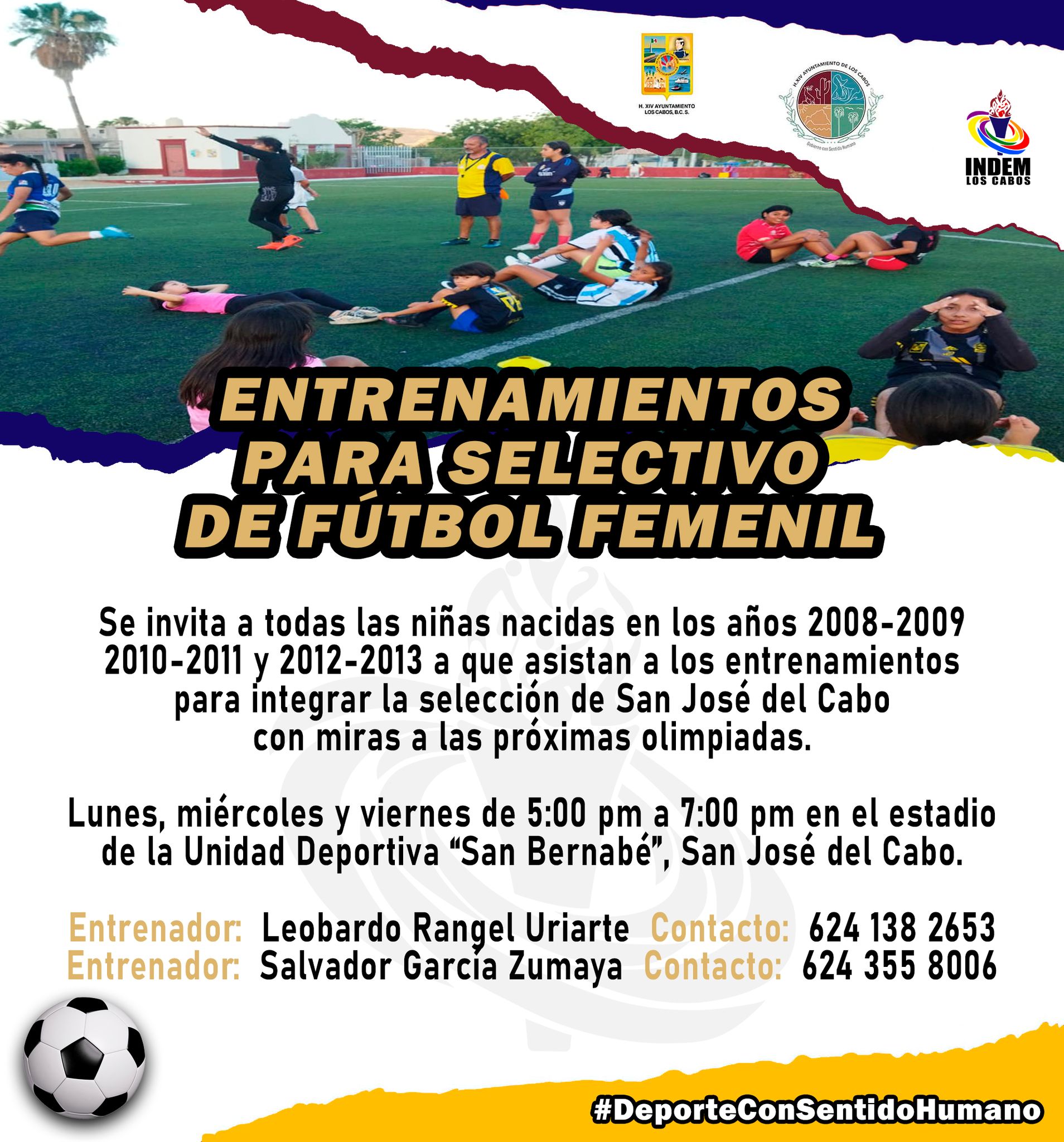 Como parte de los preparativos con miras a las próximas olimpiadas de fútbol, el Gobierno de Los Cabos a través del Instituto del Deporte (INDEM), hace una atenta invitación a todas las niñas nacidas en los años 2008-2009, 2010-2011 y 2012-2013 a que asistan a los entrenamientos sin costo, para integrar las selecciones de San José del Cabo y Cabo San Lucas con miras a las próximas olimpiadas.