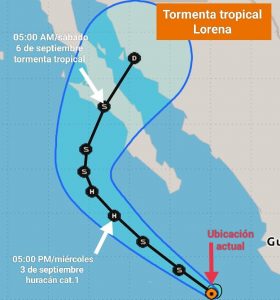 A las 09:15 horas, tiempo del centro de México, la depresión tropical Doce-E se intensificó a la tormenta tropical Lorena, en el océano Pacífico nororiental. Su centro se localizó a 385