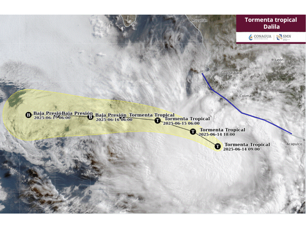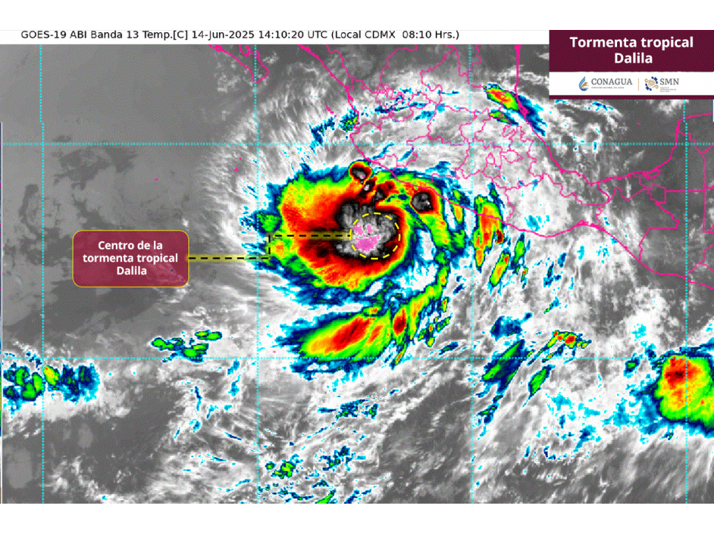La circulación de la tormenta tropical «Dalila» genera lluvias muy fuertes a intensas, rachas fuertes de viento y oleaje elevado en Jalisco, Colima, Michoacán y Guerrero, se dio a conocer en el reporte de avisos de ciclón tropical del pacífico de las 9 horas de ese sábado 14 de junio del Servicio Meteorológico Nacional perteneciente a la CONAGUA.