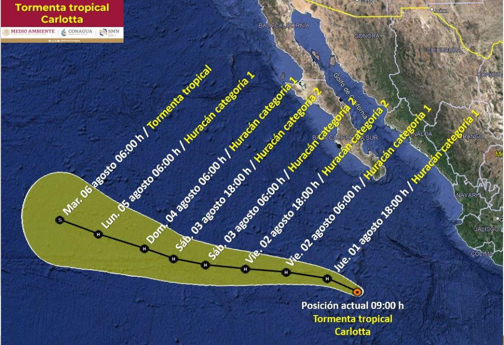 De acuerdo con el personal de Monitoreo de la Dirección Municipal de Protección Civil en Los Cabos, la amplia circulación de “Carlotta” reforzará la probabilidad de lluvias puntuales en Baja California Sur, acompañadas de descargas eléctricas, así como temperaturas elevadas, por ello, es recomendable mantener la hidratación constante para evitar golpes de calor.
