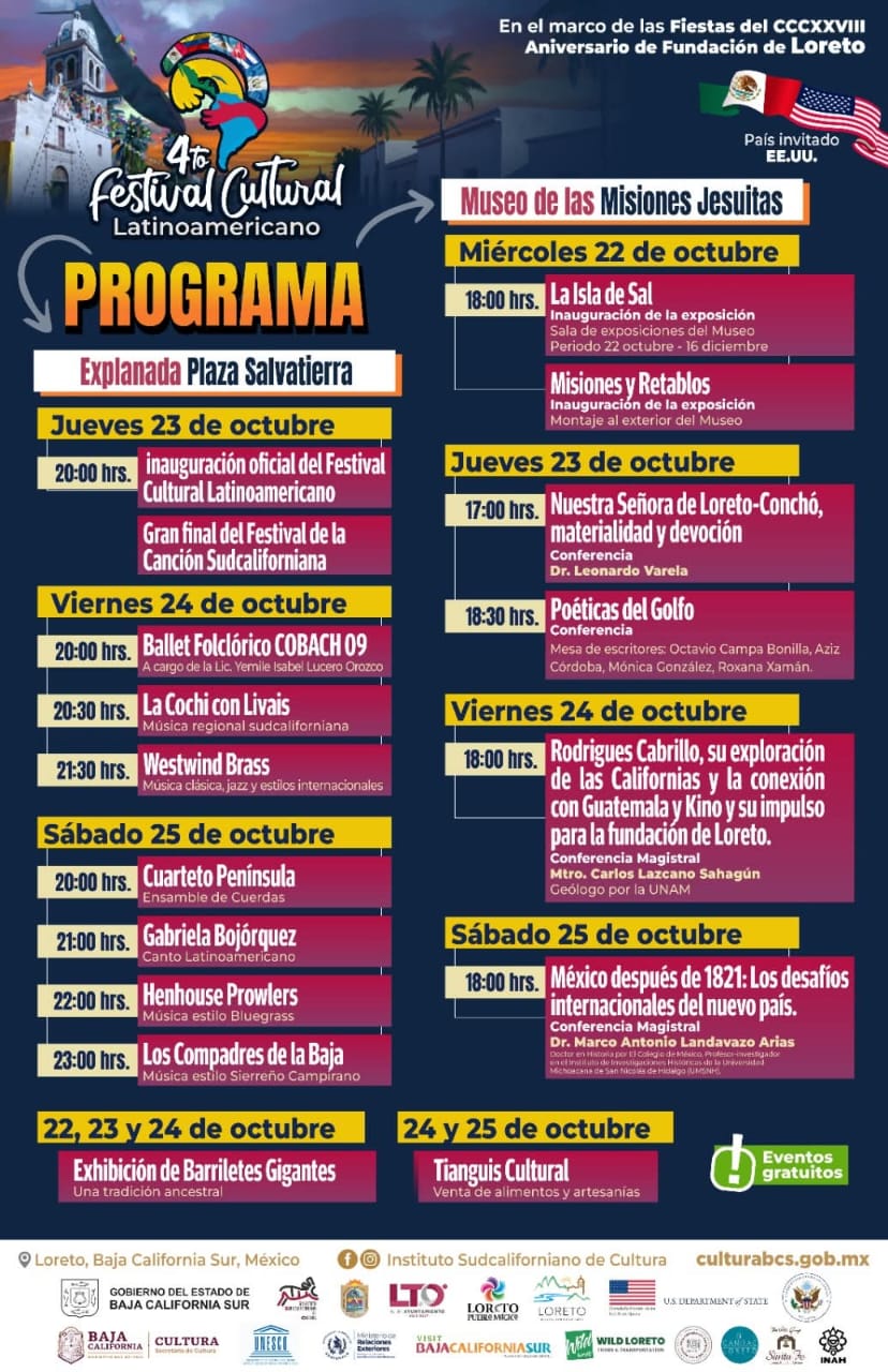 Loreto B.C.S. 13 de octubre, 2025.- El XI Ayuntamiento de Loreto en coordinación con el Gobierno del Estado de Baja California Sur a través del Instituto Sudcaliforniano de Cultura, extienden una cordial invitación a disfrutar del “Cuarto Festival Latinoamericano de Cultura” que se llevará a cabo del 22 al 25 de octubre en el Pueblo Mágico de Loreto.