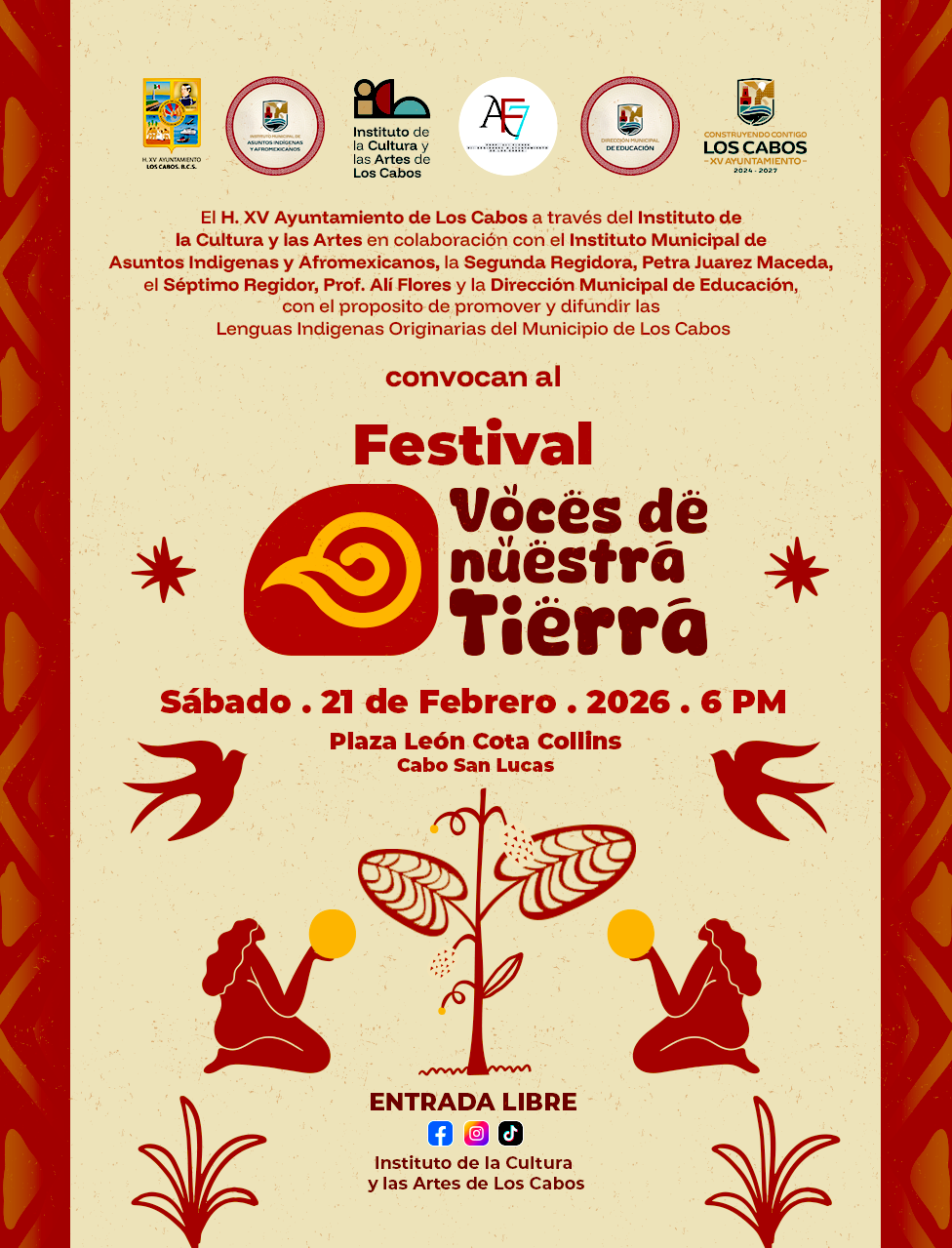 Los Cabos, Baja California Sur | 18 de febrero del 2026.– En el marco del Día Internacional de la Lengua Materna, el XV Ayuntamiento de Los Cabos, a través del Instituto de la Cultura y las Artes (ICA), en coordinación con el Instituto Municipal de Asuntos Indígenas y Afromexicanos (IMAIA), la Dirección Municipal de Educación, el VII regidor Alí Flores y la regidora María Petra Juárez Maceda, invita a la ciudadanía a participar en el Festival “Voces de Nuestra Tierra”.