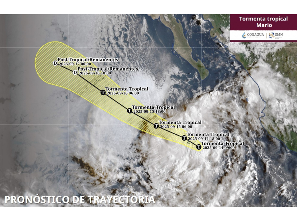 Los remanentes de Mario se han organizado e intensificado nuevamente, dando lugar a una tormenta tropical. Su circulación y desprendimientos nubosos mantendrán lluvias fuertes en Baja California Sur.