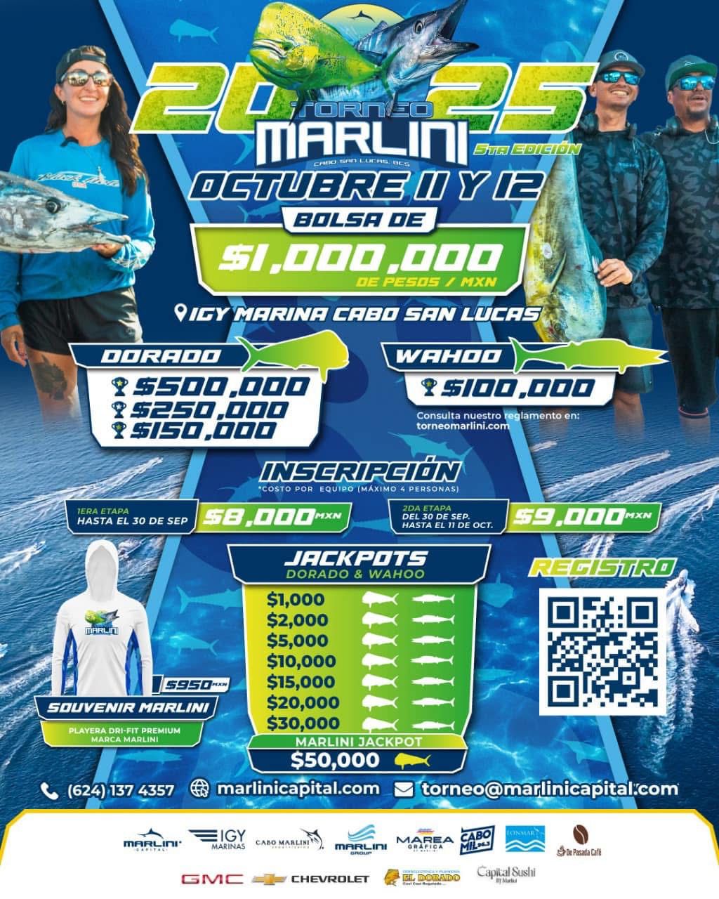 Para mayores informes e inscripciones, comunicarse al número (624) 137 4357, escribir al correo electrónico torneo@marlinicapital.com o visitar la página web www.torneomarlini.com.
