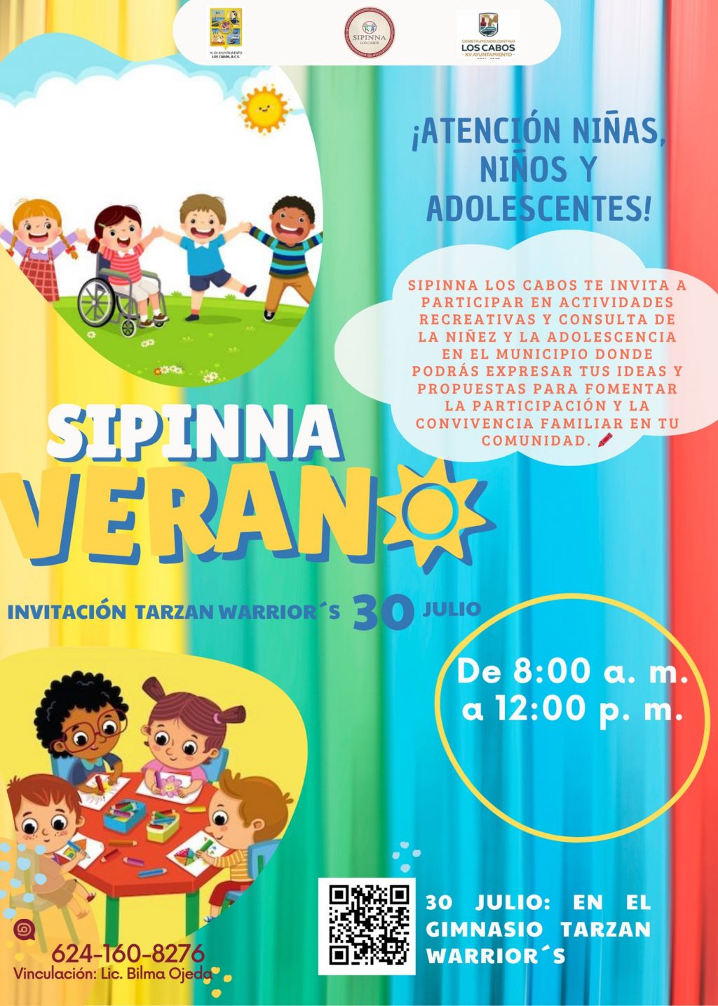 Conforme a lo detallado, SIPINNA Los Cabos, informa que esta actividad habrá de efectuarse en el gimnasio Tarzán Warrior, de 8:00 de la mañana a 12:00 del mediodía. El presente comunicado anexa el código QR para consultar la ubicación exacta, además del número telefónico de contacto.