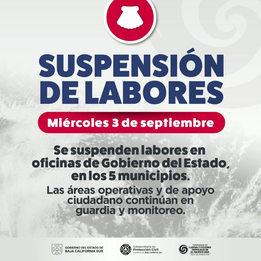 La Paz, Baja California Sur, a 3 de septiembre de 2025.– El Gobierno del Estado informa que se determinó la suspensión de actividades laborales de este miércoles 3 de septiembre en las oficinas de la administración pública de los cinco municipios de Baja California Sur.