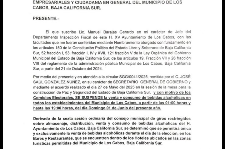 1 min de lectura Los Cabos Municipios Autorizan en Los Cabos venta de bebidas alcohólicas en bares y restaurantes ubicados dentro de hoteles, este domingo 30 mayo, 2025 Juan Manuel Geraldo Permitida venta de bebidas alcohólicas en bares y restaurantes ubicados dentro de hoteles de Los…