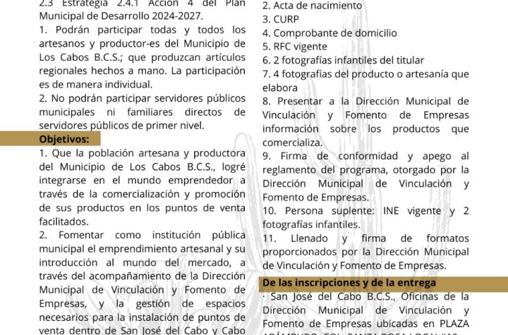 Los Cabos Municipios Convocan a artesanos y productores a participar en el programa “Orígenes de Los Cabos” 12 febrero, 2025 redacción Los Cabos, Baja California Sur.- El XV Ayuntamiento de Los Cabos, a través de la…
