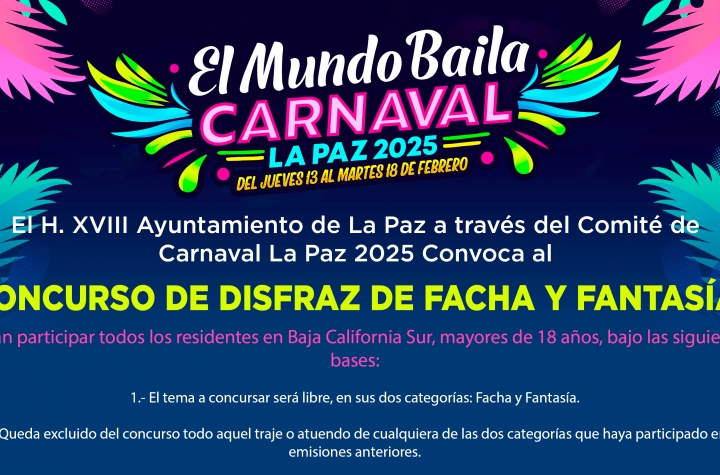 Destacadas Invitan a participar en el concurso de disfraz de Facha y Fantasía del Carnaval La Paz 2025 11 enero, 2025 redacción La convocatoria se encuentra abierta hasta el jueves 6 de febrero El H. XVIII Ayuntamiento…