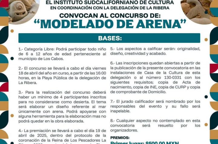 1 min de lectura Los Cabos Municipios Invitan a participar en el concurso infantil “Modelado de Arena” en La Ribera 2 abril, 2025 Juan Manuel Geraldo Los Cabos, Baja California Sur | 2 de abril del 2025.– Como parte del programa…