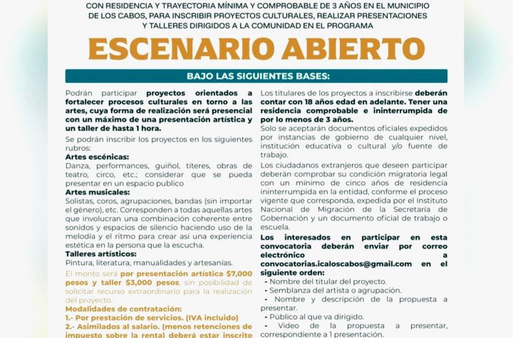 1 min de lectura Los Cabos Municipios Invitan a participar en el programa cultural “Escenario Abierto” 2025 en Los Cabos 5 mayo, 2025 Juan Manuel Geraldo Los Cabos, Baja California Sur 5 de mayo del 2025.- Con el objetivo de fomentar…