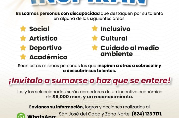 Los Cabos Municipios Lanza IMDIS Los Cabos convocatoria Talentos que Inspiran para reconocer a personas con discapacidad 20 noviembre, 2025 redacción Otorgarán 10 apoyos económicos de $6 mil pesos Los Cabos, Baja California Sur | 20…
