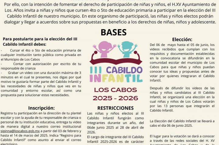 1 min de lectura Los Cabos Municipios Invitan a niñas y niños de Los Cabos a formar parte del III Cabildo Infantil 2025-2026 1 junio, 2025 Juan Manuel Geraldo La elección del Cabildo Infantil se llevará a cabo el 18 de junio del…