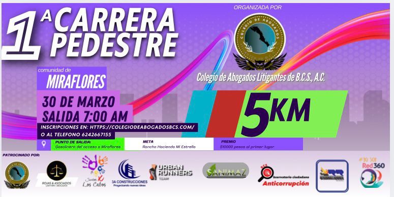 l Colegio de Abogados Litigantes de B.C.S. AC ya tiene todo listo para realizar por primera vez la carrera pedestre “Senderos de BCS”, que se realizará este 30 de marzo con salida en la delegación de Miraflores en punto de las 7:00am horas.