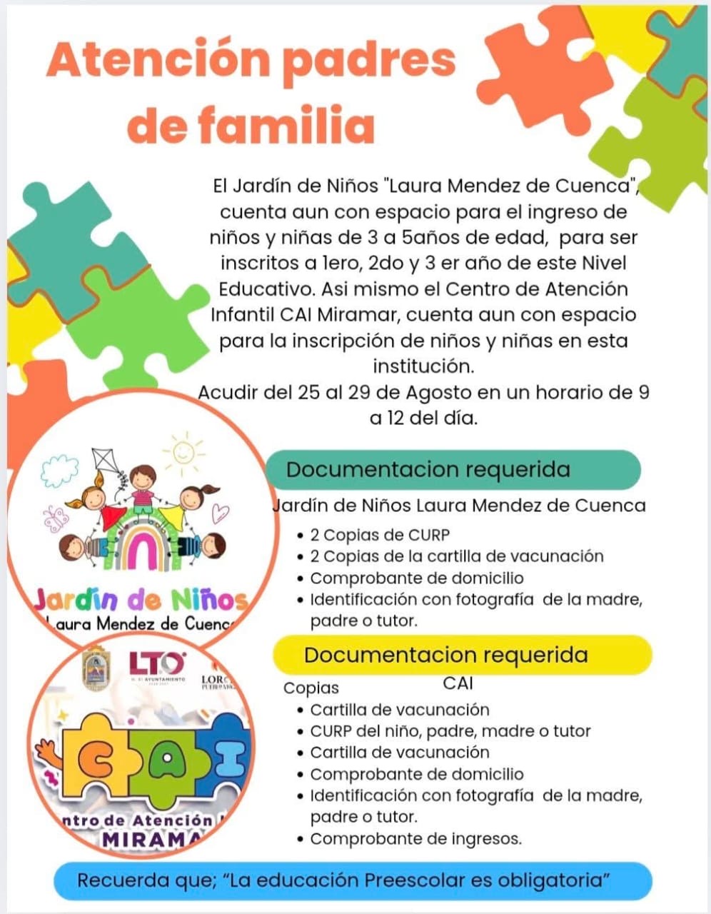 Loreto, B.C.S. 26 de agosto, 2025.– El XI Ayuntamiento de Loreto a través del departamento de educación municipal, hace del conocimiento que, del 25 al 29 de agosto en horario de 9:00 am a 12:00 pm, estarán abiertas las inscripciones en el jardín de niños “Laura Méndez de Cuenca” en colonia Miramar.