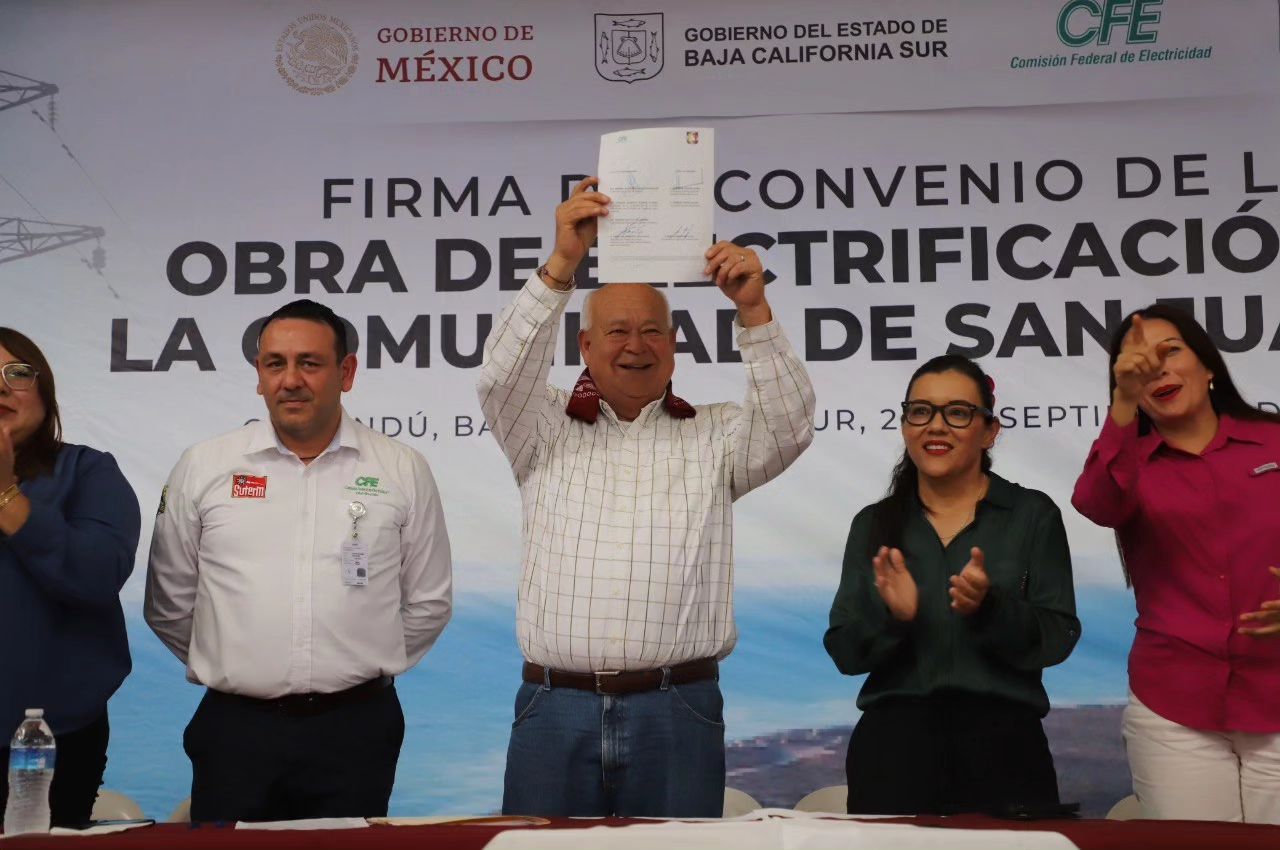 El gobernador Víctor Manuel Castro Cosío regresó a San Juanico, en el municipio de Comondú, para firmar un convenio con la Comisión Federal de Electricidad y hacer realidad el anhelo de familias de esta comunidad de contar con energía eléctrica y con ello, mejores condiciones de bienestar y desarrollo.
