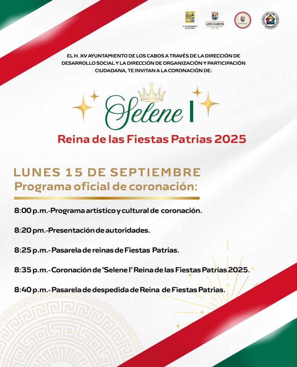 En San José del Cabo, el programa artístico y cultural dará inicio a las 20:00 horas en la explanada de la plaza pública Teniente José Antonio Mijares. Durante la jornada se presentará la pasarela de reinas y, a las 20:35 horas, se llevará a cabo la coronación de “Selene I” como reina de las Fiestas Patrias 2025. Posteriormente, desde el balcón del palacio municipal, el presidente municipal Christian Agúndez Gómez encabezará el tradicional Grito de Independencia a las 22:00 horas.