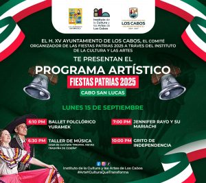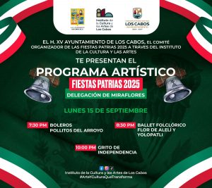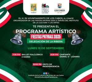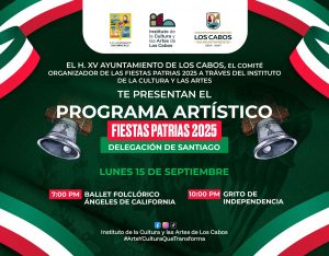 Los Cabos, Baja California Sur | 14 de septiembre del 2025.- El XV Ayuntamiento de Los Cabos invita a toda la ciudadanía a disfrutar de los festejos con motivo de las Fiestas Patrias 2025, que se llevarán a cabo este lunes 15 de septiembre en la cabecera municipal y en las diferentes delegaciones.