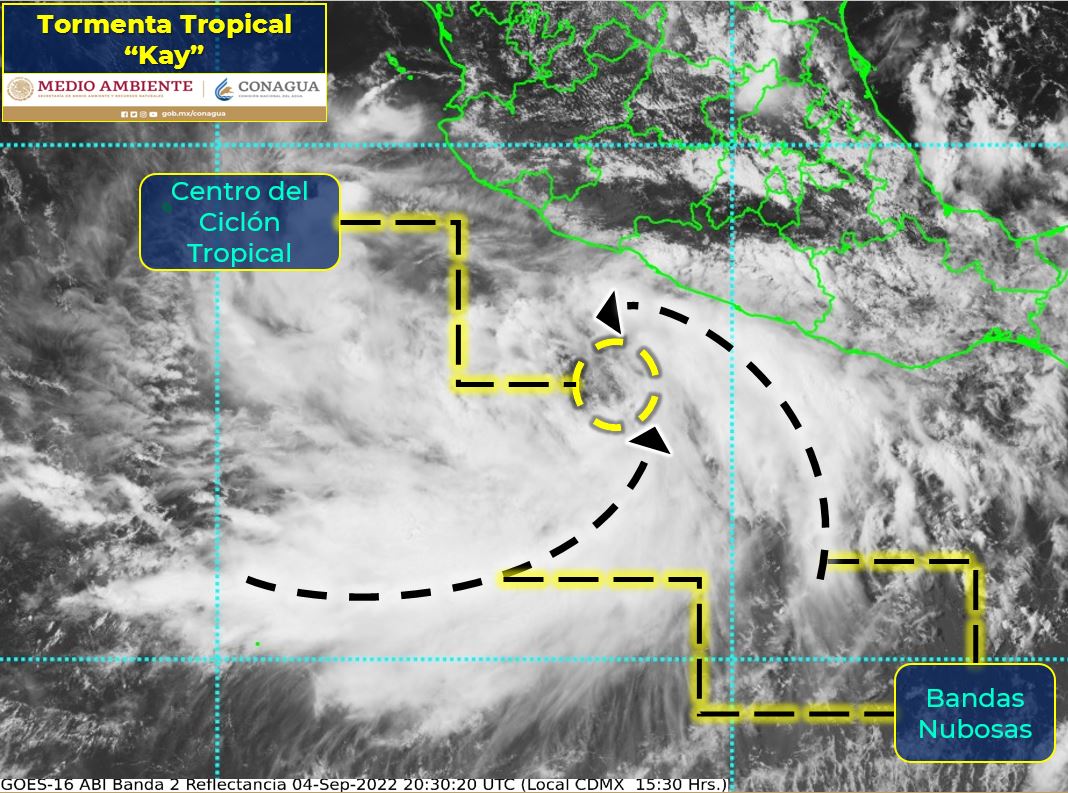 La Depresión Tropical “Doce-E” se intensificó a la Tormenta Troical «Kay» al sur de Michoacán y Guerrero. Su amplia circulación ocasiona lluvias fuertes a intensas, que podrían generar incremento en los niveles de ríos y arroyos, deslaves e inundaciones en el occidente, centro y sur de México, con lluvias puntuales torrenciales en Guerrero. Además, se pronostican vientos fuertes y oleaje elevado en las costas de Jalisco, Colima, Michoacán, Guerrero y Oaxaca.